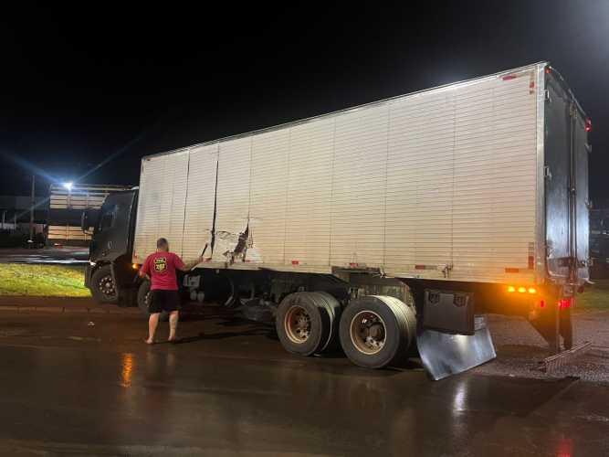 Uma colisão entre dois caminhões chamou a atenção de motoristas na noite do domingo (21 de dezembro de 2025) na rotatória da Avenida Lions Internacional,
