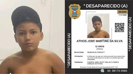 Um adolescente de 12 anos, identificado como Athos José Martins da Silva, conhecido como Pitico, desapareceu no último domingo (11 de janeiro de 2026) após
