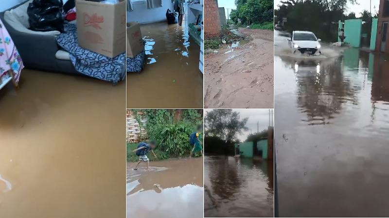 Os principais estragos foram registrados na Rua dos Bentevis, nas proximidades da Escola Juvenília Monteiro de Oliveira. Vídeos enviados por moradores mostram a força da enxurrada, com água entrando nas casas e objetos boiando dentro dos imóveis.