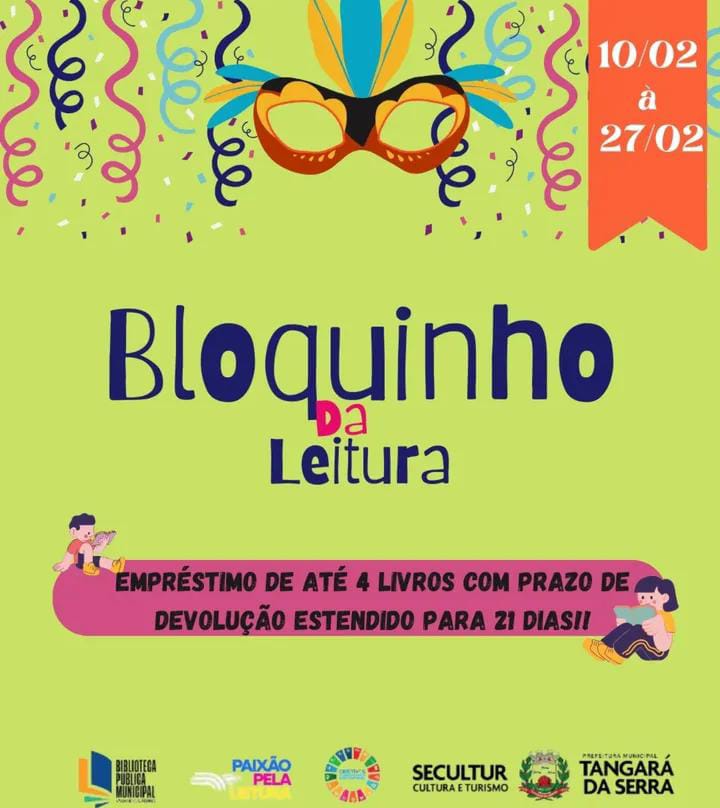 A Biblioteca Pública Municipal “Viviane Costa dos Santos Ferro” realiza, entre os dias 10 á 27 de fevereiro, o Bloquinho da Leitura, uma iniciativa que une o clima carnavalesco ao incentivo à leitura. A proposta é fomentar o acesso democrático à cultura por meio dos livros e fortalecer a presença da biblioteca no cotidiano da população tangaraense.