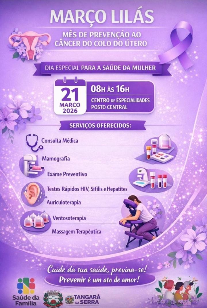 A Prefeitura de Tangará da Serra, por meio da Secretaria Municipal de Saúde, realiza neste dia 21 de março uma ação especial em alusão ao Março Lilás, campanha dedicada à prevenção do câncer do colo do útero. Os atendimentos acontecem das 8h às 16h, no Centro de Especialidades do Posto Central.